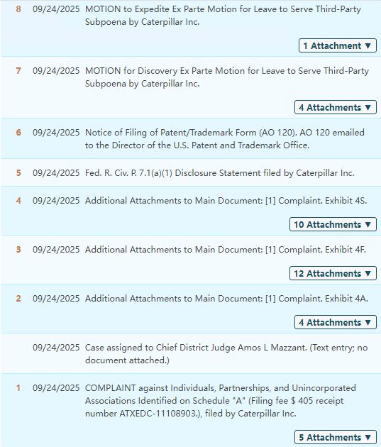 近日,由知名律所Foley & Lardner LLP代理的Caterpillar Inc.(卡特彼勒公司)专利维权案引发行业震动。该案编号为2025-cv-01050,核心争议点在于Ebay平台部分卖家未经授权使用其发动机滤清器盖子的外观专利(专利号:D754304)。据Allen团队调查,此案已锁定29家店铺、76条侵权链接,完整名单可向专业机构申请获取。值得注意的是,除专利纠纷外,原告名下的CATERPILLAR及CAT商标同样受严格保护,未经授权使用将面临TRO(临时限制令)冻结风险。
