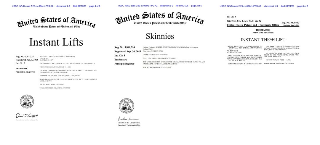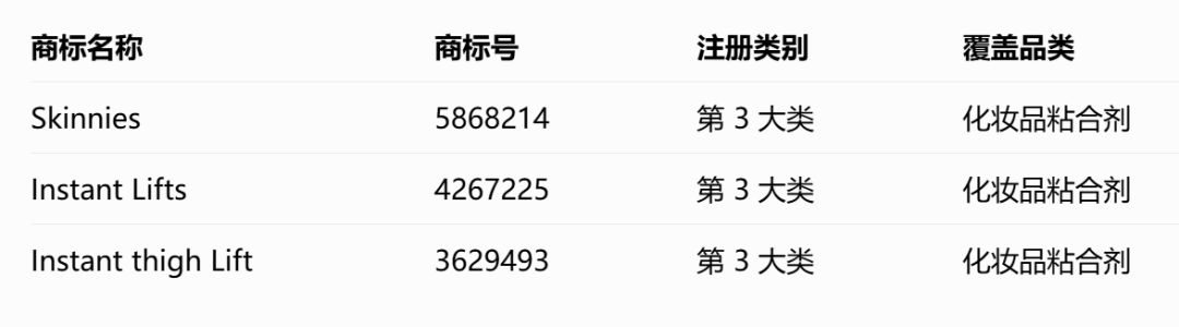 本次维权行动聚焦于Uplifting Essentials LLC旗下三个核心商标:Skinnies(商标号5868214)、Instant Lifts(商标号4267225)以及Instant thigh Lift(商标号3629493)。这三个商标均注册于国际分类第3大类,覆盖化妆品粘合剂及相关个人护理产品领域。