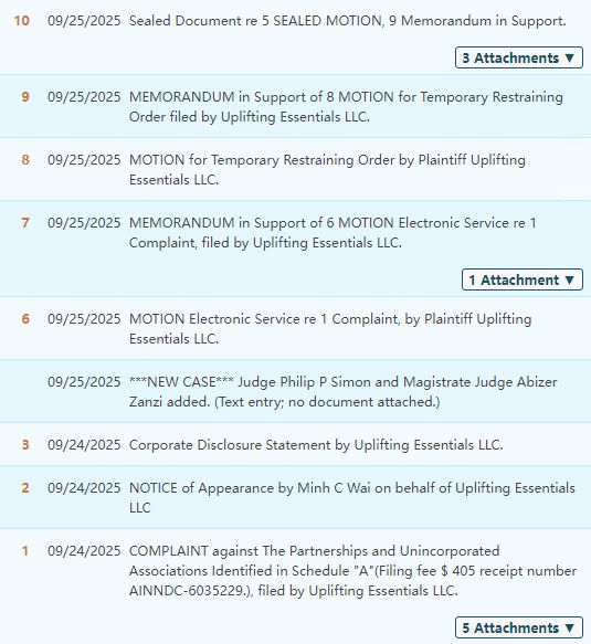 本案由Quintairos,Prieto,Wood & Boyer,P.A.律师事务所代理Uplifting Essentials LLC,在美国印第安纳州北区地方法院发起商标维权行动,案件编号为2025-cv-00441。目前全网公开信息显示,该案件已引发跨境电商领域广泛关注,多个法律论坛及行业资讯平台均对此案进行了跟踪报道。