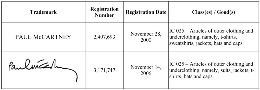 文字商标核心:涉案核心商标为 “Paul McCartney” 纯文字标识,涵盖手写体、印刷体等多种样式,其中最易侵权的是带有手写签名风格的字体 —— 字母 “P” 尾部带弧度弯钩,“McCartney” 中 “c” 与 “C” 呈连笔设计。需要特别注意的是,MPL公司虽在第41类(教育娱乐)注册有G873553号商标,但在第25类服饰品类的商标布局采用 “多样式覆盖” 策略,无论是全拼、缩写 “Macca” 还是中英文组合 “保罗・麦卡特尼”,均受保护;