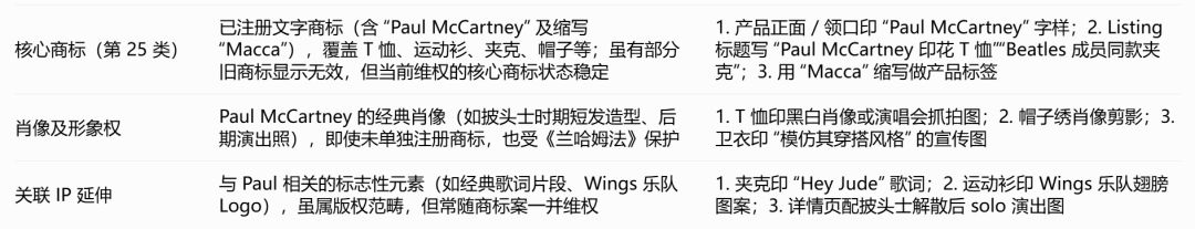 Paul McCartney作为全球顶级摇滚IP,其商标保护范围远超普通品牌,Allen团队结合美国专利商标局(USPTO)公开信息及行业案例,整理出3类核心侵权识别点: