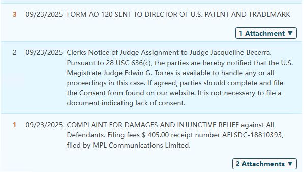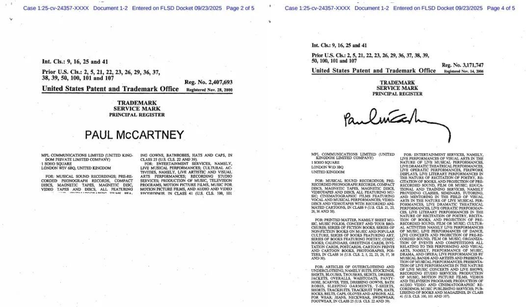 前披头士成员Paul Mc Cartney旗下的MPL Communications Limited,已经通过SMG律所在美国发起商标侵权诉讼(案件编号:2025-cv-24357)。这次维权直接瞄准第25大类服饰,T恤、夹克、帽子全在列,目前案件刚进入前期立案阶段,还没批TRO临时限制令,但参考SMG律所9月刚代理LV维权时“7天取证、10天冻资”的节奏,留给卖家的排查时间可能只剩一周。