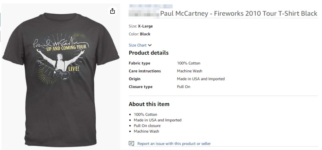 禁用延伸场景:不仅产品本体,包装、吊牌、宣传图中出现相关标识均算侵权。更隐蔽的是Listing中的描述性使用,如 “Paul McCartney同款复古T恤”“致敬披头士麦卡特尼夹克” 等表述,即便产品无直接商标,也可能被认定为 “搭便车” 式侵权。