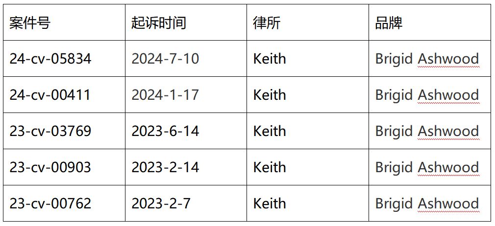 艺术家Brigid Ashwood在2023年2月7日至2024年7月10日间,通过Keith律所发起5次版权侵权维权,涉及案件号23-cv-00762(2023-2-7)、23-cv-00903(2023-2-14)、23-cv-03769(2023-6-14)、24-cv-00411(2024-1-17)、24-cv-05834(2024-7-10)。