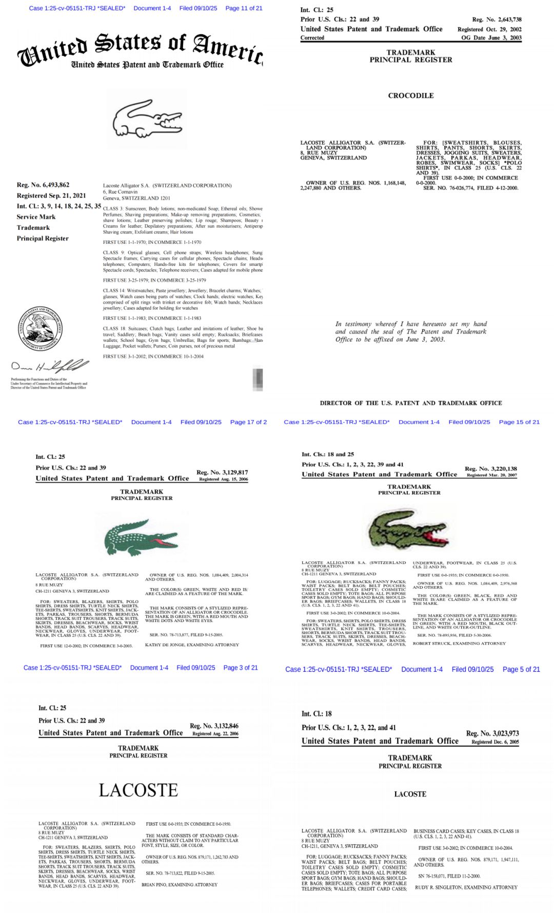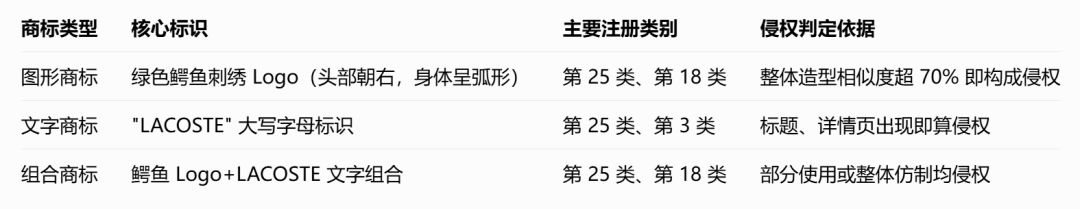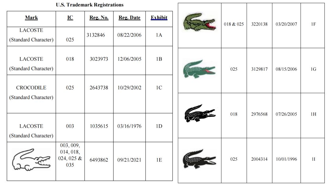 Lacoste品牌核心商标,包括但不限于鳄鱼图形商标(注册号详见起诉文件)、文字商标“LACOSTE”及“LACOSTE ALLIGATOR S.A.”全称。全球范围内电商平台,重点打击服装、鞋履、配饰等类目商品。Lacoste的维权商标形成 "文字 + 图形" 双重保护网,Allen团队结合USPTO及海关备案信息整理关键要点: