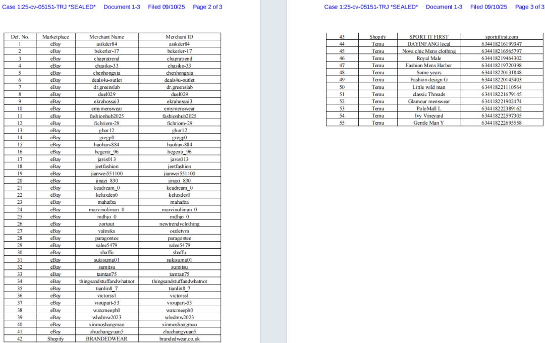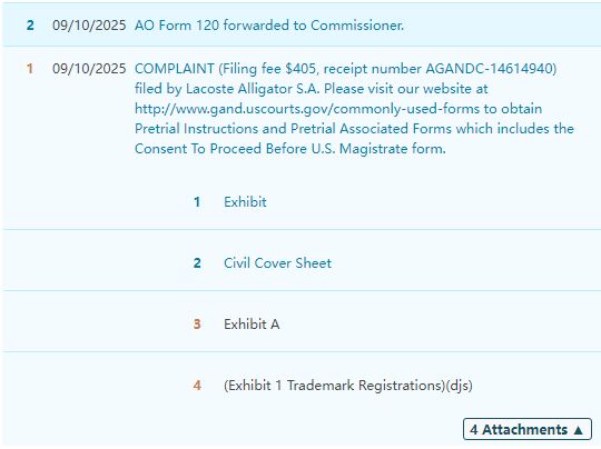 本次维权由佛罗里达州知名知识产权律所Sriplaw代理法国品牌Lacoste Alligator S.A. 发起,Allen团队第一时间追踪案件动态并提供卖家支持,案件已于2025年9月10日在佐治亚州北区联邦地区法院正式立案(案件编号:2025-cv-05151)。从已锁定的涉案范围看,55 家侵权店铺呈现明显平台集中性,主要涉及未经授权使用鳄鱼Logo及 "LACOSTE" 文字商标的商品。Allen团队注意到,Sriplaw在本案中延续了其标志性的 "隐匿取证" 策略,早在立案前3个月就已伪装买家完成下单取证,连产品包装、Listing图片中的商标细节都已固定为证据。