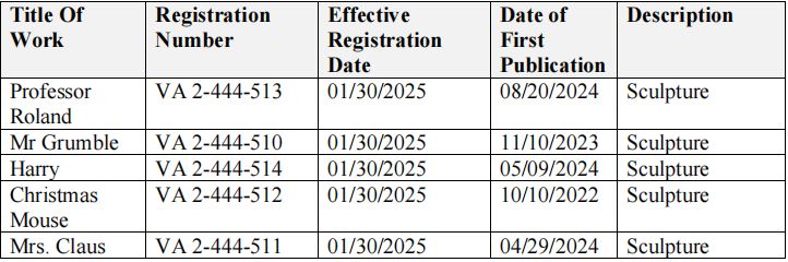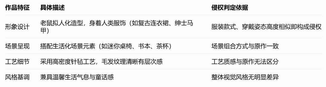 本次维权的5项核心版权均为拟人化针毡小老鼠雕塑含穿着人类服饰的厨师、医生、学生等形象),Allen团队结合公开资料整理了侵权比对要点: