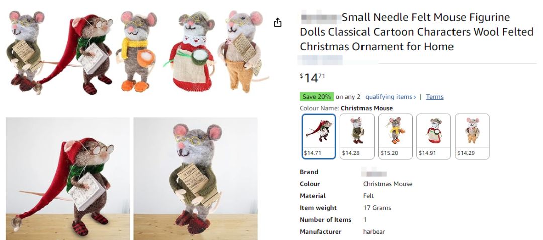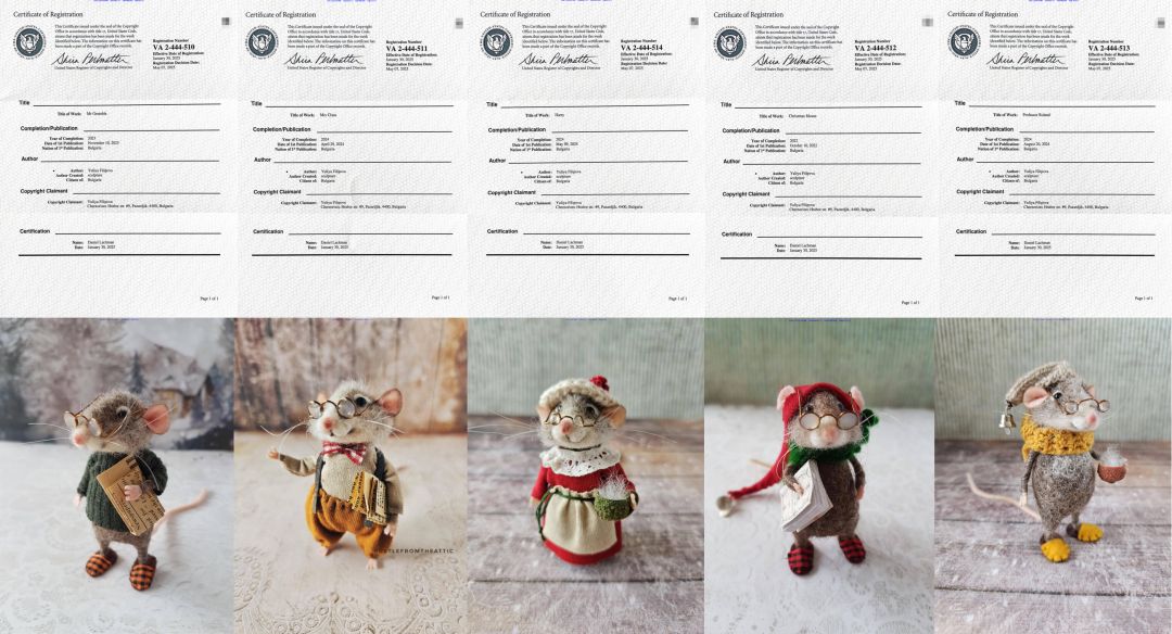 自查重点:先在Yuliya的个人官网(可联系 Allen团获取链接)下载原作图片,再打开自家店铺Listing,用手机同时展示两张图对比,重点看老鼠姿态、服装样式、场景搭配这三点,有两点相似就赶紧下架。在店铺后台搜索 “Yuliya Filipova”“needle felt mouse”“anthropomorphic mouse” 等关键词,不管是标题还是详情页出现都得删除。
