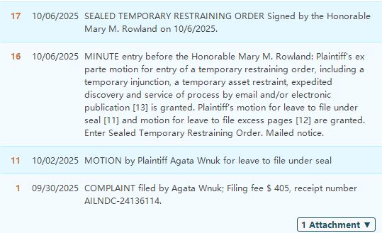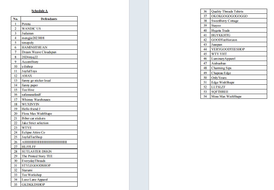 本次维权由美国知识产权领域老牌律所Keith代理波兰设计师Agata Wnuk(笔名Hello Cloudy)发起,Allen团队第一时间追踪案件动态并提供卖家支持。案件节奏快得惊人,9月30日刚在联邦法院立案(案件编号:2025-cv-11936),仅6天后(10月6日)TRO(临时限制令)就正式获批,目前已有54家跨境店铺的账户被冻结,涉及资金从3万到28万美元不等。