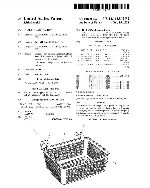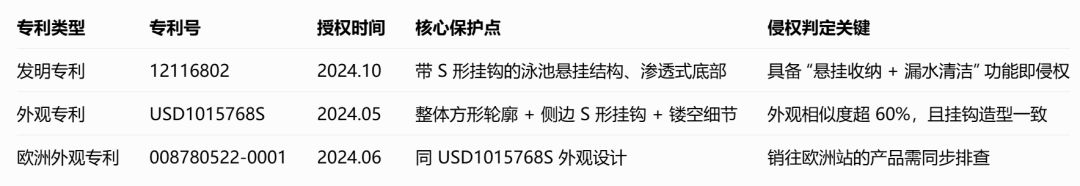 自查重点:产品比对,检查储物篮是否包含S形挂钩结构或类似模块化设计;确认产品描述是否提及“适配框架泳池”“防水耐氯”等专利关联术语;删除listing中涉及Ca-Sa品牌名(如Carrie Box)的关键词;下架与专利附图高度相似的产品图片。