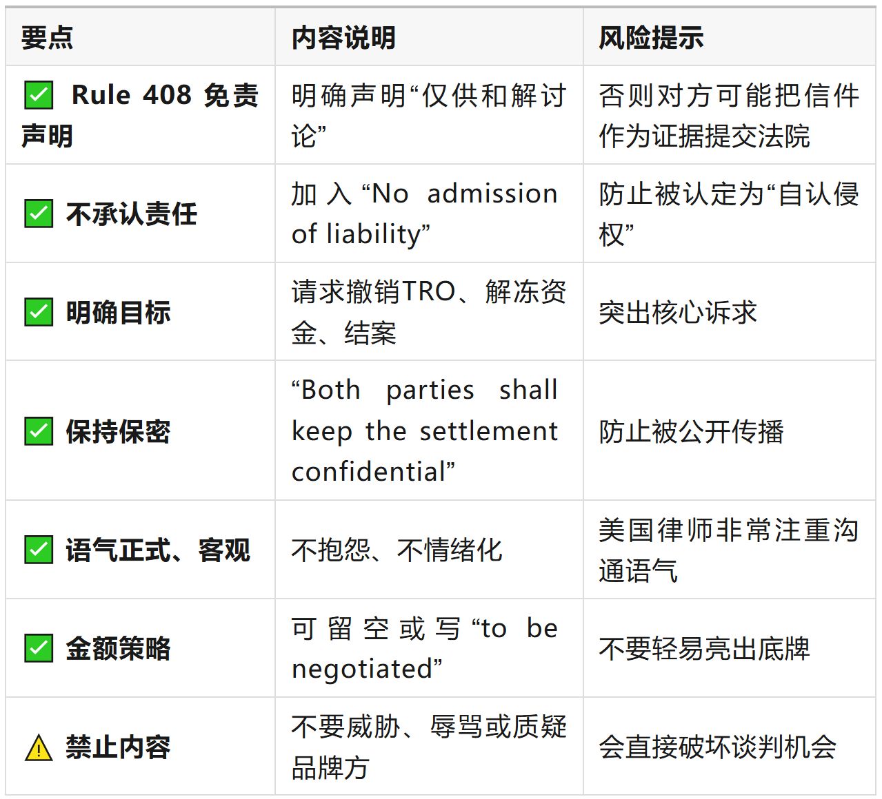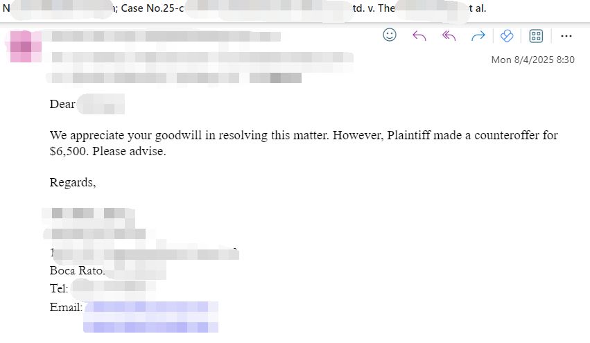 这是进入法律沟通的“唯一通道”在美国TRO案件中,平台只是执行法院命令的一方,并没有权力解除冻结。要想让资金解冻、案件终止,必须由原告(或其律师)主动向法院提交撤销申请。而原告律师是唯一有资格代表品牌方与卖家沟通和解的人。也就是说,这封信就是卖家与原告沟通的第一步、也是唯一合法入口。这也是表达诚意、保护自己的“试探信”美国律师事务所每天都会收到大量邮件,只有格式规范、表达清晰、语气正式的沟通才会被认真对待。一封标准的Settlement Proposal能传递三个信号: