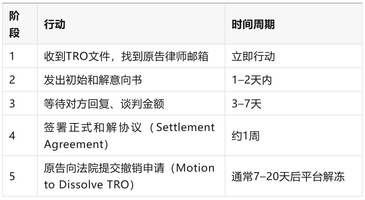 越早联系,越有主动权。TRO通常有效14天(可延长一次),越早展现诚意,越可能降低和解金额。
