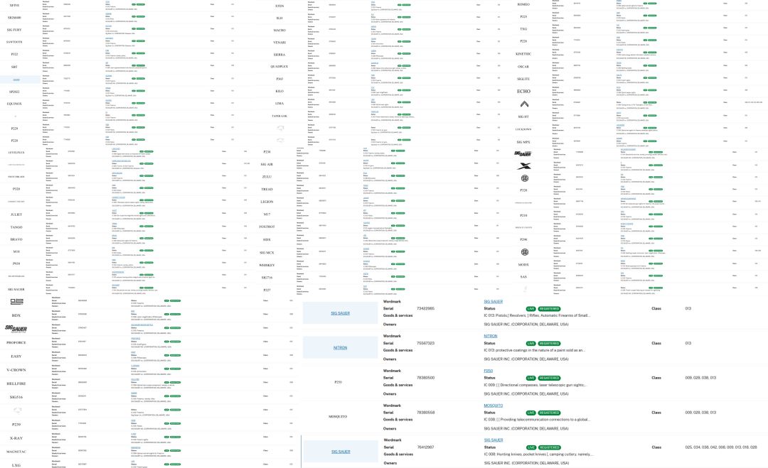 Allen团队通过USPTO(美国专利商标局)核查发现Sig Sauer注册的90个商标覆盖10大类目,其中以下10个是维权 “重灾区”,卖家需重点盯防: