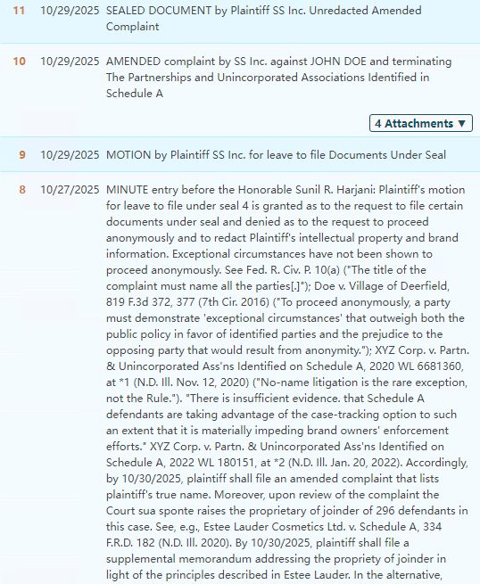 本案由Flener律所代表Sig Sauer Inc.以名义为SS Inc. et al.向美国法院提起的商标维权诉讼,涉及两个案号:2025-cv-12595和2025-cv-12965。起诉之初,原告曾要求匿名方式进行诉讼,但法院以“匿名诉讼违背司法公开原则,原告不得隐藏身份”理由驳回匿名请求,并要求原告说明为何将多达297名被告 合并入案是合理合法的。当前,原告虽然已披露自身身份,但商标本身、被告店铺、侵权细节等仍大多处于密封状态。