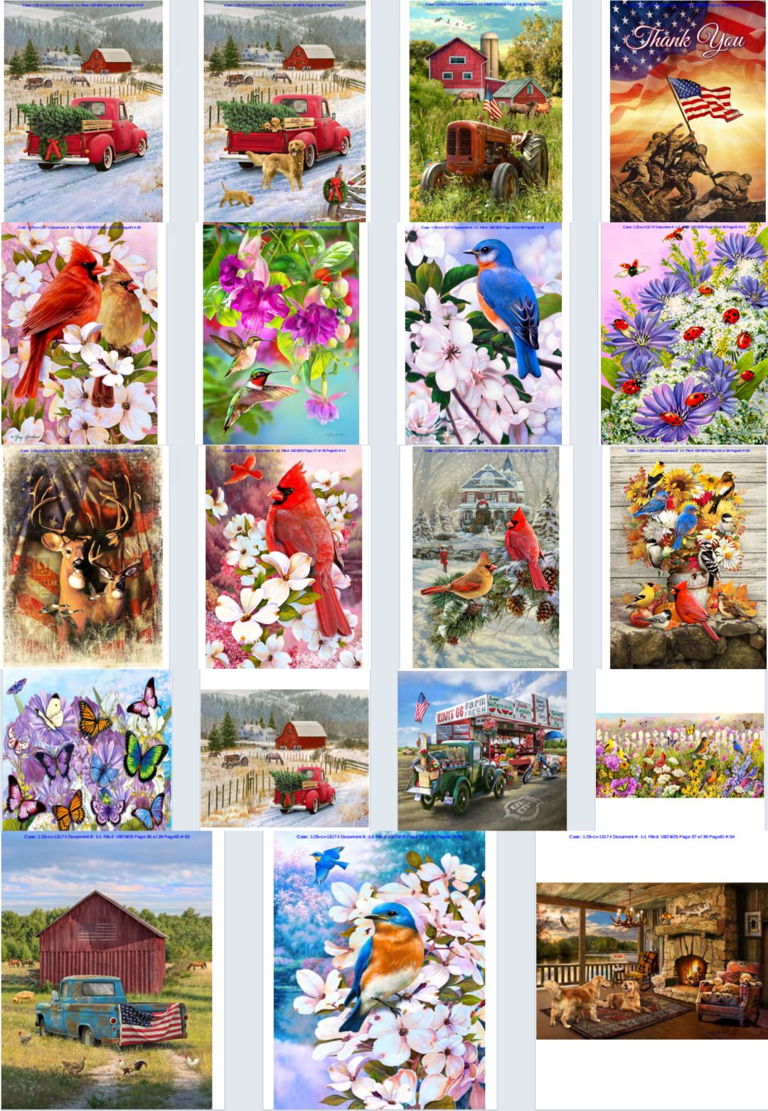 本次案件共涉及19个版权作品,版权号分别为:VA 2-160-387、 VA 2-368-491、 VA 2-375-496、 VA 2-225-813、 VA 2-249-478、 VA 2-228-622、 VA 2-249-434、 VA 2-380-498、 VA 2-228-627、 VA 2-241-650、 VA 2-241-187、 VA 2-249-370、 VA 2-228-606、 VA 2-239-035、 VA 2-234-392、 VA 2-228-595、 VA 2-225-270、 VA 2-228-629和 VA 2-228-597。这些作品涵盖了乡村自然风景、鸟类等多个主题,每一幅都凝聚了艺术家Greg Giordano的心血与才华。维权覆盖范围广泛,涉及家居装饰、文具、礼品等多个产品类别,卖家们需仔细核查自身产品,确保不侵犯相关版权。