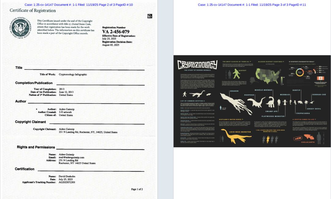 由Keith律所代理美国创意设计师Aiden Guinnip发起的一起版权维权诉讼,案号2025-cv-14147。原告诉称,其于2025年7月25日 在美国获得版权登记,版权号为VA 2-456-079的作品为一幅“神秘动物学海报”,描绘神秘动物学 (“cryptozoology”) 的丰富画面。海报以剪影插图风格呈现不同神秘生物,每种轮廓以不同颜色分隔,兼具视觉清晰性与神秘感。原告主张:若未经授权将海报中的任一部分用于商业用途(例如将部分拼接进其他作品中),可能构成侵权,存在TRO冻结风险。