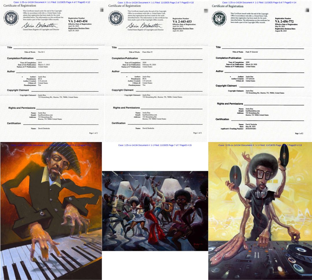 原告Justin Bua已登记三项版权作品,注册号如前所述。Bua的作品融合街头文化与现代艺术,以DJ、涂鸦、爵士乐手等作为主要题材,具有强烈的视觉辨识度。若有卖家未经授权将这些版权作品用于商品(如印花服饰、画作复制、装饰品等)、在产品包装或广告素材中使用,均可能构成侵权。