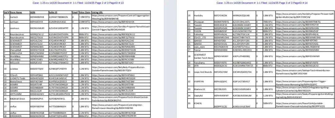 本案是Keener律所代理YSN Imports LLC dba Flame King发起的商标维权案件,案件编号2025-cv-14328。据Allen团队全网搜索同案件号数据发现,截至目前,共有35个亚马逊店铺涉案被起诉侵权原告商标,详细名单可联系Allen团队获取。销售相关品类的卖家在选品时需格外注意避雷,避免误用Flame King商标词,导致账户陷入TRO(临时限制令)风险。关注Allen团队,可持续跟进案件后续进展!