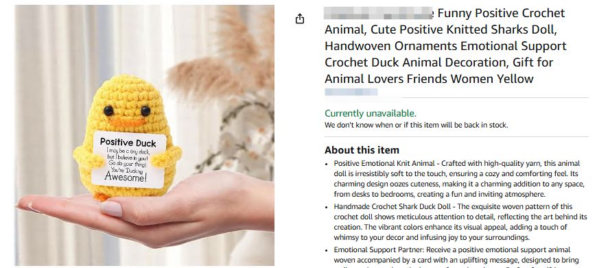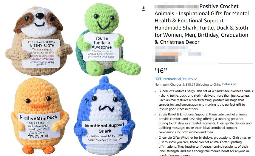 Shiwen Chen是一位来自中国深圳的卖家,专注于针织玩偶的产品研发与设计。其创作的针织玩偶独具特色,无论是可爱的钩针小海龟,还是俏皮的钩针小黄鸭,每一款玩偶都精心设计,手持励志卡片。这些玩偶不仅能为用户的家居环境增添温馨氛围,无论是装饰客厅、卧室,还是摆放在办公桌上,都能成为一道亮丽的风景线;同时也是送人的绝佳选择,在平凡的生活中为他人带去笑容和慰藉,给予人们力量和鼓励。