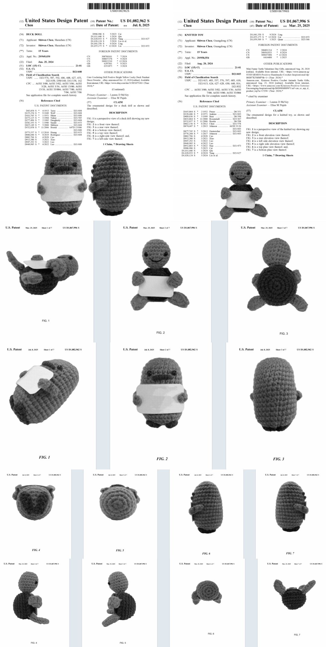 Shiwen Chen作为原告,此次维权主要基于其在美国获得的两个外观专利。这两个专利均与针织玩偶相关,具体为2025年3月25日下证的D1067996专利,以及2025年7月8日下证的D1082962专利。这两个专利是Shiwen Chen在针织玩偶领域知识产权保护的重要成果,也是本次维权的核心依据。维权覆盖范围主要针对美国市场。产品类别明确为针织玩偶,涵盖各种以针织工艺制作的玩偶产品,无论其造型、尺寸、颜色等如何变化,只要涉及侵犯上述两个外观专利,都可能成为本次维权的对象。