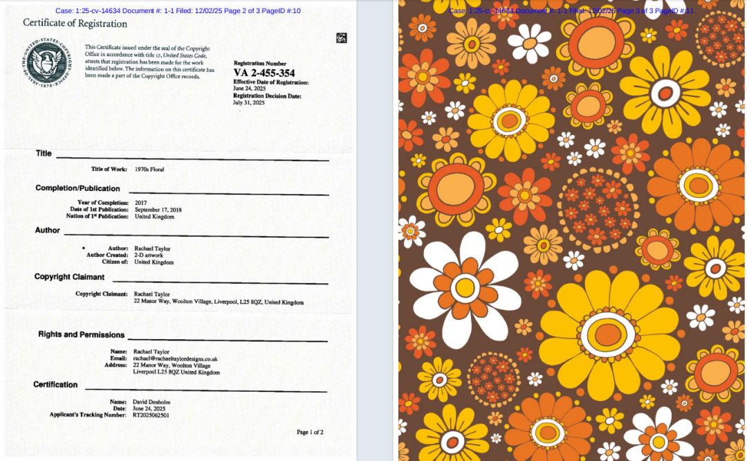 近期,keith律所代理英国艺术家Rachael Taylor发起了一场版权维权行动,案件编号为2025-cv-14634。涉案作品是一张极具特色的1970年代小雏菊花卉图,该作品于2025年6月24日成功获得美国版权认证,版权号为VA 2 -455-354。据业内消息,keith律所正在积极收集证据,准备向法院提交更充分的材料,以推动TRO的获批。一旦TRO获批,未经授权使用涉案作品的跨境卖家将面临账户资金被冻结、店铺运营受限等严重后果。不少同行卖家反馈,已收到平台关于此案件的预警提示,大家都在紧急排查自家产品,避免踩雷。